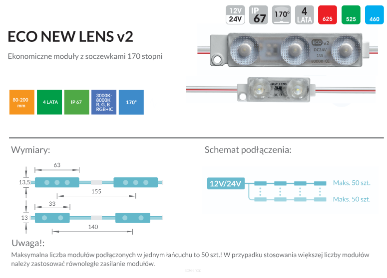Maksymalna liczba modułów podłączonych w jednym łańcuchu to 50 szt! W przypadku stosowania większej liczby modułów należy zastosować równoległe zasilanie łańcuchów.