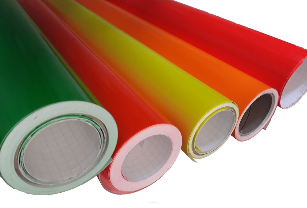 Folia fluorescencyjna wylewana charakteryzująca się jaskrawymi kolorami, stworzona do wykonywania bardzo widocznej reklamy na pojazdach lub etykietach, mająca przyciągać uwagę.