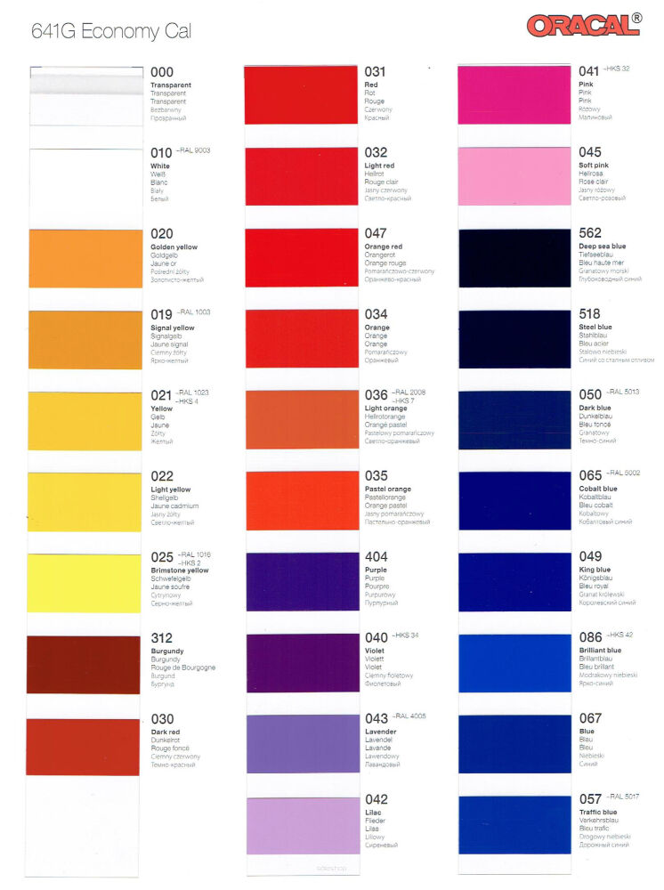 Oracal folia ploterowa seria 641 to samoprzylepna folia PVC (grubość 75 mikronów) połysk i mat na jednostronnie powlekanym papierze silikonowanym.