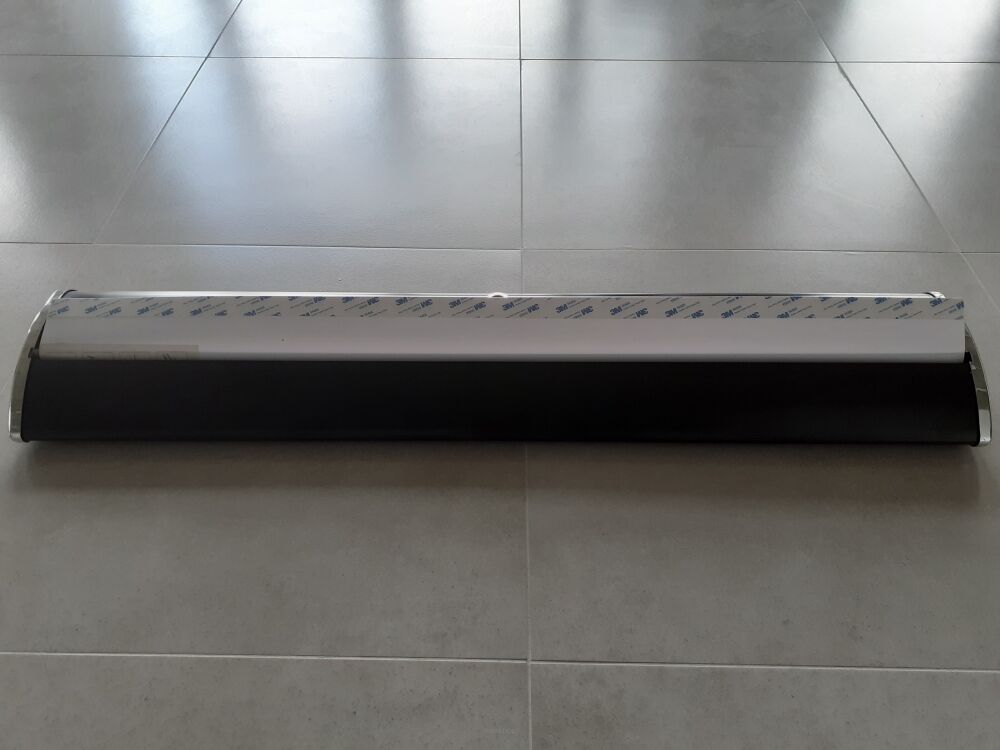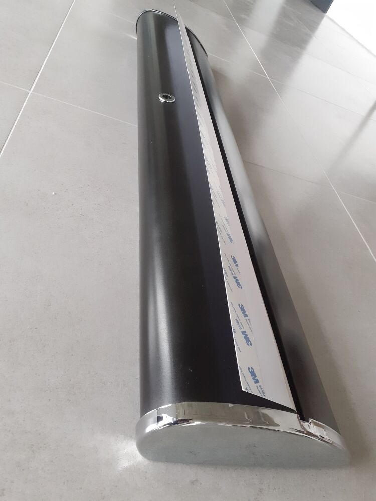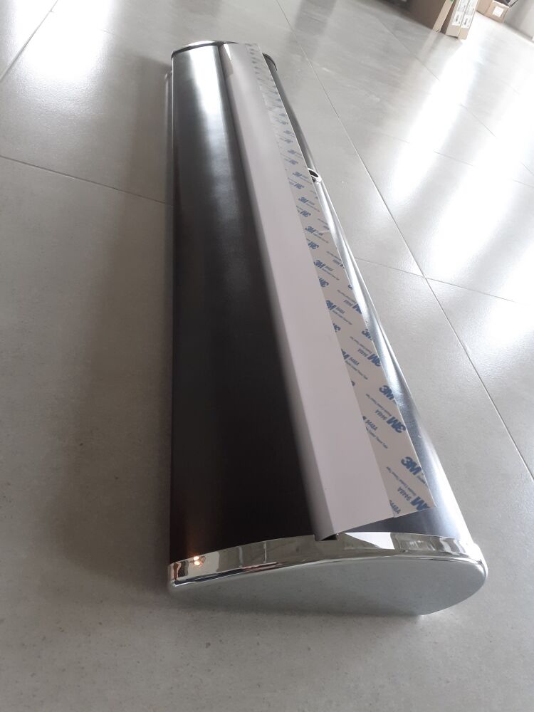 Montaż grafiki reklamowej ułatwia górna listwa zaciskowa z haczykiem. Dół jest przyklejany na taśmę 3M.