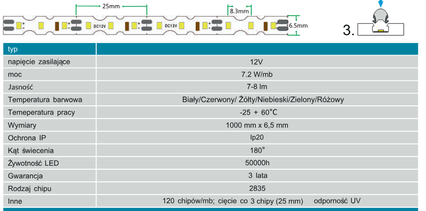 Taśma LED z giętkim, elastycznym podłożem, które umożliwia jej montaż na każdej powierzchni o dowolnym kształcie. Taśma LED 2835 może być cięta na krótkie odcinki po 3 diody, a jej sekcje cięcia znajdują się co 2,5 cm.
